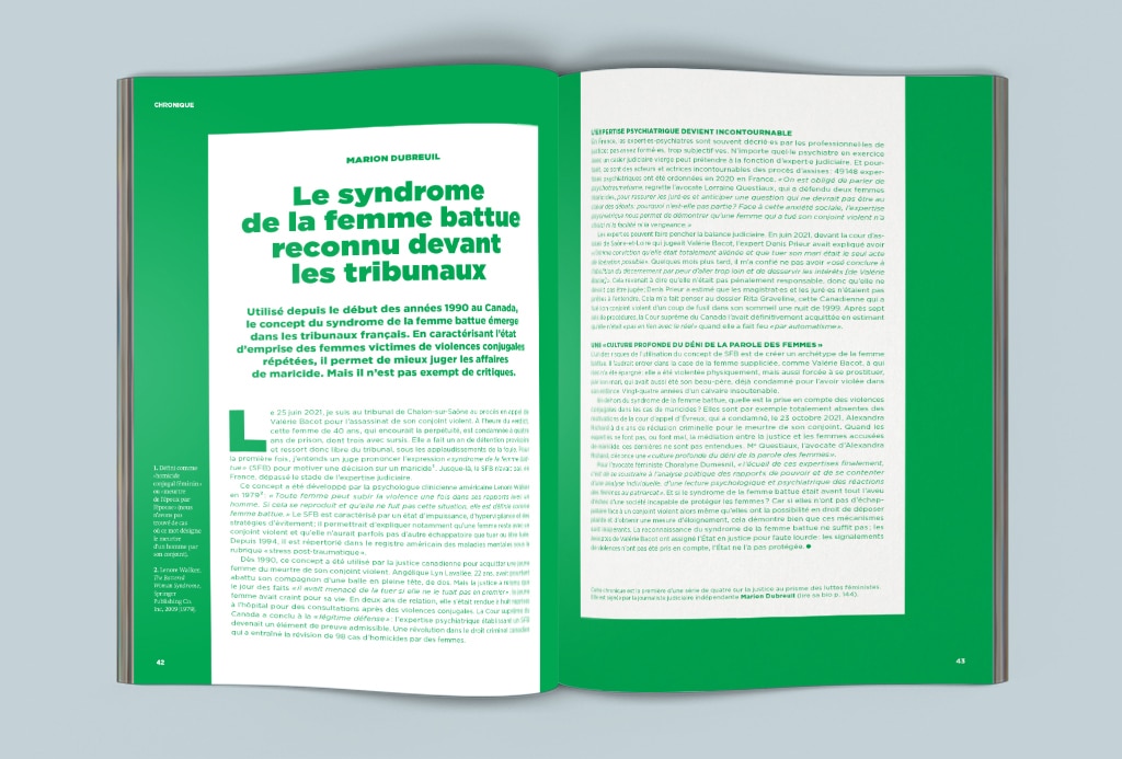 En France, les expert·es-psychiatres sont souvent décrié·es par les professionnel·les de justice : pas assez formé·es, trop subjectif·ves. N’importe quel·le psychiatre en exercice avec un casier judiciaire vierge peut prétendre à la fonction d’expert·e judiciaire. Et pourtant, ce sont des acteurs et actrices incontournables des procès d’assises : 49148 expertises psychiatriques ont été ordonnées en 2020 en France. « On est obligé de parler de psychotraumatisme, regrette l’avocate Lorraine Questiaux, qui a défendu deux femmes maricides, pour rassurer les juré·es et anticiper une question qui ne devrait pas être au coeur des débats!: pourquoi n’est-elle pas partie ? Face à cette anxiété sociale, l’expertise psychiatrique nous permet de démontrer qu’une femme qui a tué son conjoint violent n’a choisi ni la facilité ni la vengeance. »